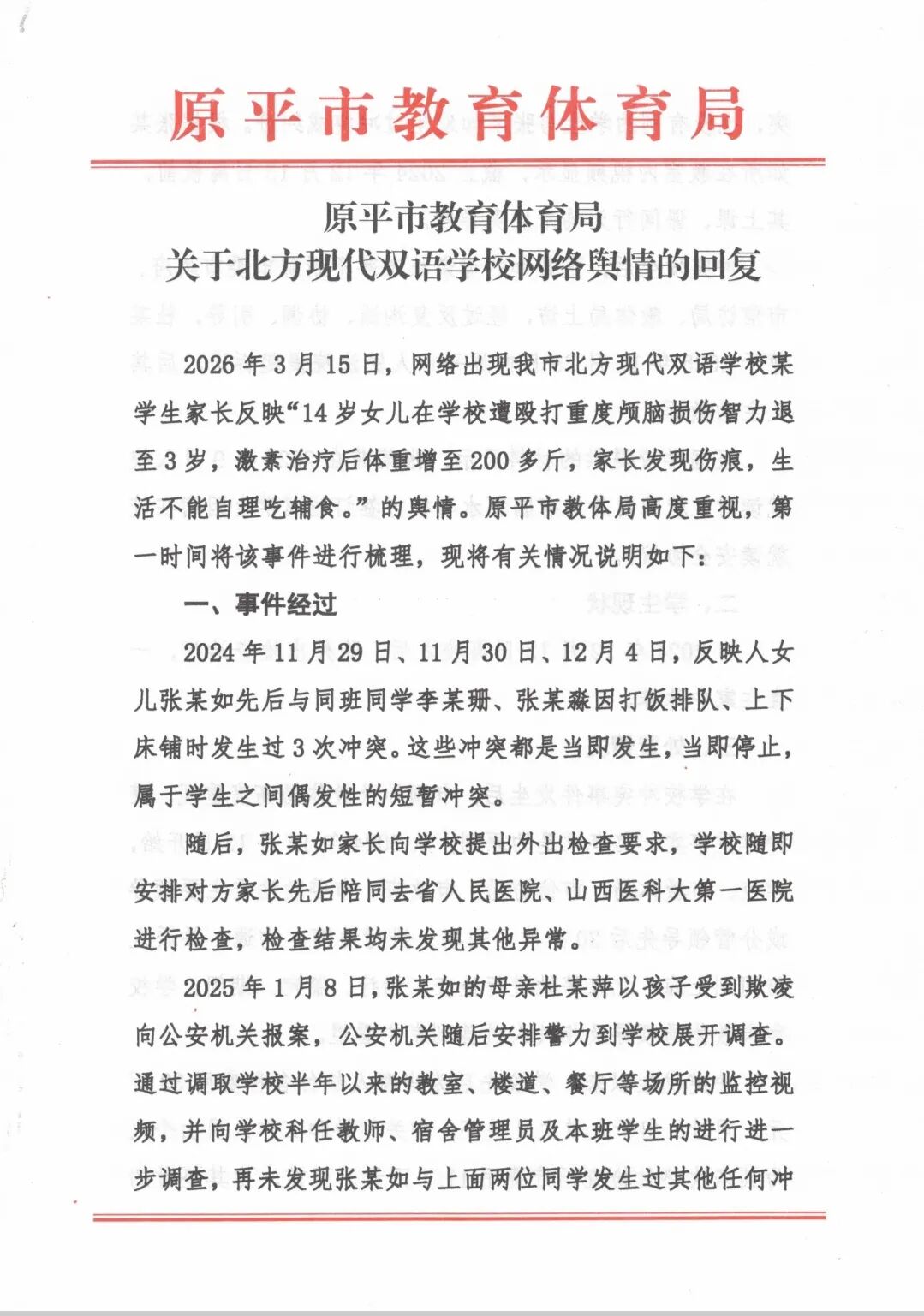 2026年3月15日,网络出现我市北方现代双语学校某学生家长反映“14岁女儿在学校遭殴打重度颅脑损伤智力退至3岁,激素治疗后体重增至200多斤,家长发现伤痕,生活不能自理吃辅食。”的舆情。原平市教体局高度重视,第一时间将该事件进行梳理,现将有关情况说明如下: