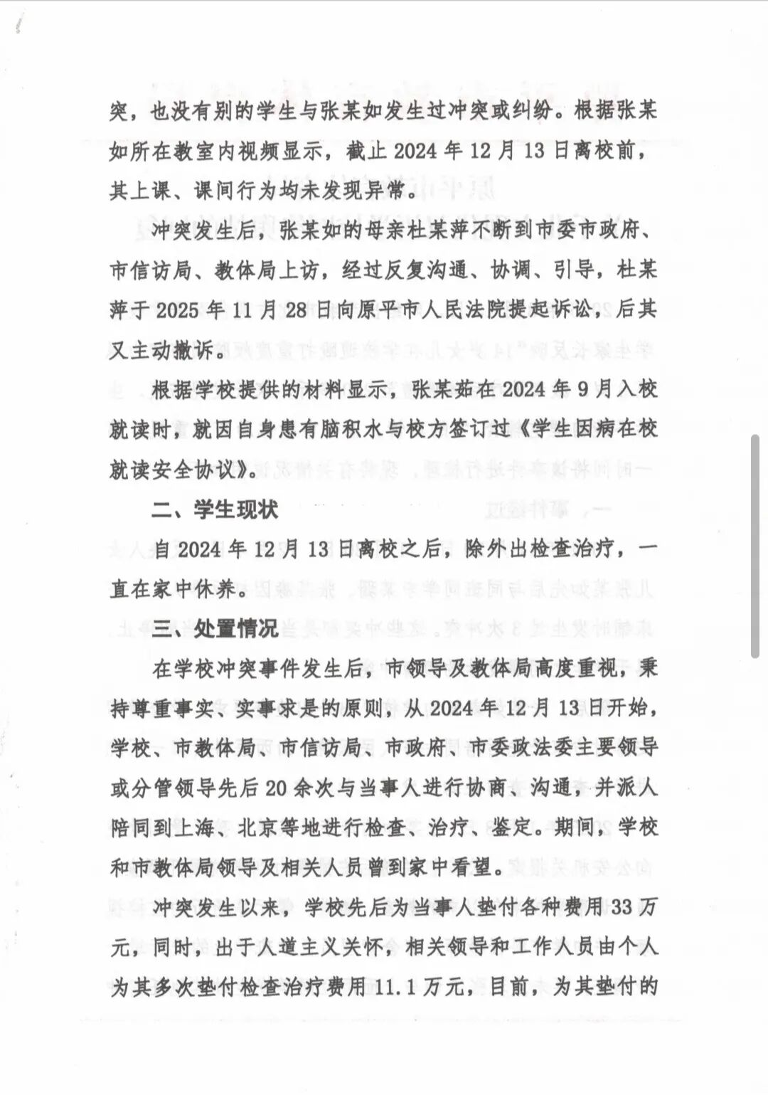 冲突发生后,张某如的母亲杜某萍不断到市委市政府、市信访局、教体局上访,经过反复沟通、协调、引导,杜某萍于2025年11月28日向原平市人民法院提起诉讼,后其又主动撤诉。
