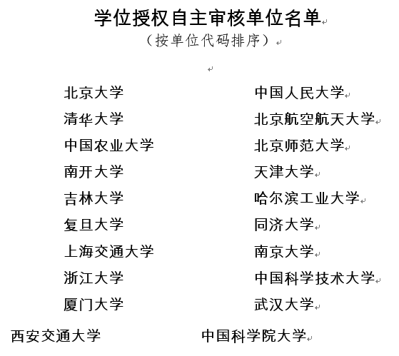 国务院学位委员会日前印发《关于高等学校开展学位授权自主审核工作的意见》及学位授权自主审核单位名单,北京大学、清华大学、中国人民大学、北京航空航天大学等20所高校获准开展学位授权自主审核。