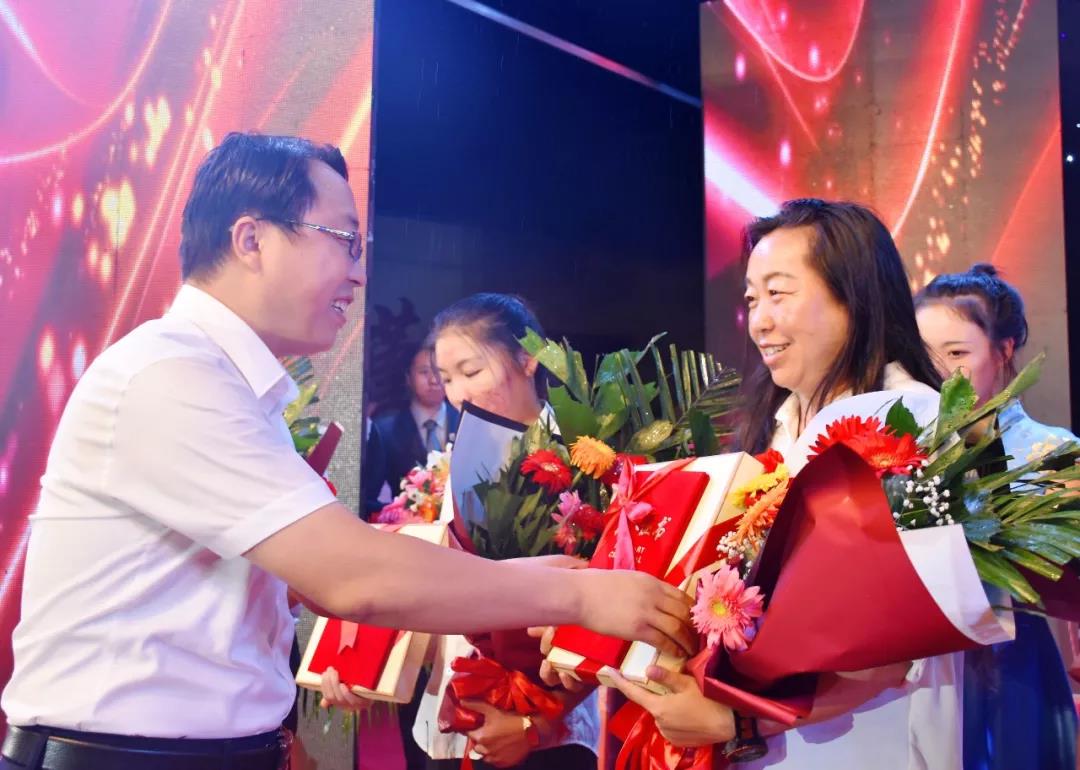 王宇校长为荣获"最佳师德奖"与“最佳团队”、“模范中层干部”颁发证书、奖品与鲜花。