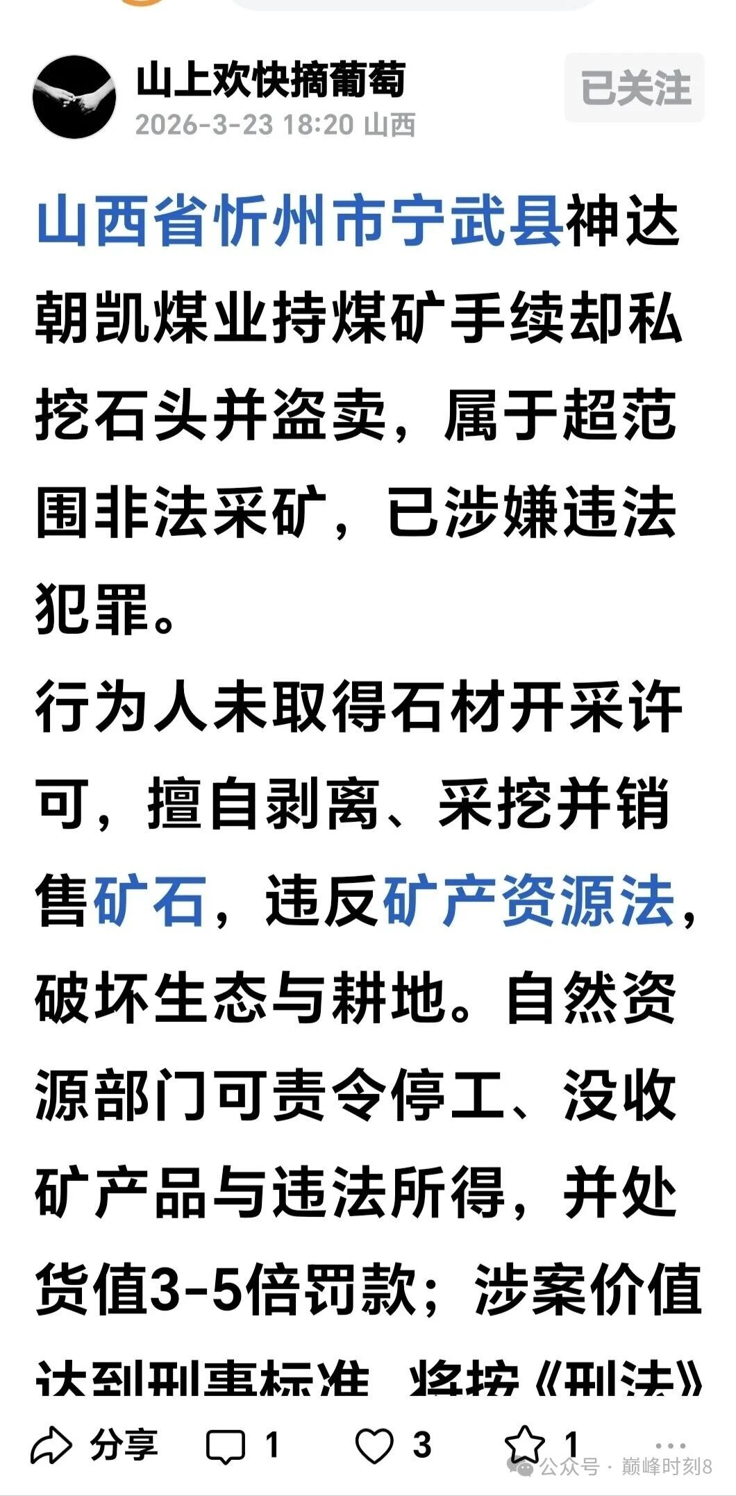 山西省忻州市宁武县神达朝凯煤业持煤矿手续却私挖石头并盗卖,属于超范围非法采矿,已涉嫌违法犯罪。行为人未取得石材开采许可,擅自剥离、采挖并销售矿石,违反矿产资源法,破坏生态与耕地。自然资源部门可责令停工、没收矿产品与违法所得,并处货值3-5倍罚款;涉案价值达到刑事标准,将按《刑法》第三百四十三条非法采矿罪icon追责,情节严重可处三年以下有期徒刑,情节特别严重最高可判七年并处罚金。同时,涉事煤矿可能被吊销相关证照,相关责任人终身追责。