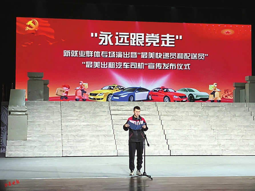(记者 杨晶)在城市里,有这样一群人,他们的身影穿梭于大街小巷,忙碌于各个角落。快递员、外卖骑手、网约车司机、出租车司机……这些新就业群体,用辛勤与汗水,默默推动着城市的发展,成为城市中不可或缺的力量。12月14日,在“永远跟党走”新就业群体专场演出暨“最美快递员和配送员”“最美出租汽车司机”宣传发布仪式上,20位“最美快递员、配送员”和“最美出租车司机”受到表彰。让这些在平凡岗位上默默奋斗的工作者,走到了聚光灯下,接受大众的赞誉。