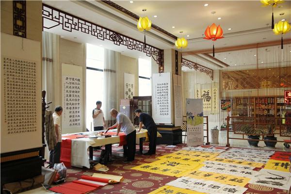 金都山庄茶艺大厅中弥漫着浓浓的艺术氛围,书画展示交流活动进入高潮。